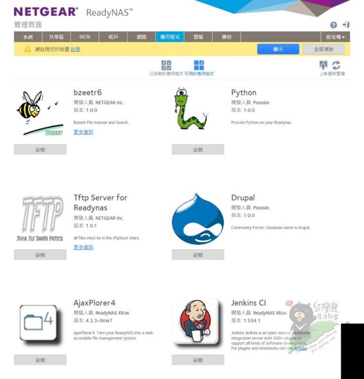READYNAS也可以當DNS SERVER、MAIL SERVER、VPN SERVER、NVR (Surveillance)、MYsql SERVER…及雲端使用,當然社群、論壇、網站、FTP……包括教學、商用、BT下載這些應用程式也有咯!