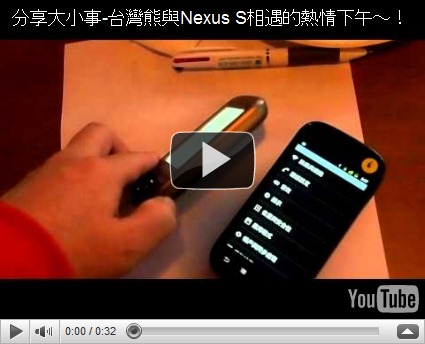 這一段不直接放上分享影片、對Alias掏心掏肺賣力的分享會對不起,所以直接放上影音短片跟大家共享,希望對所有使用愛用Google Nexus S(還有其他Smart Phone)的使用者有所幫助!(Nanako與C Jay的影片也有、不過因為風格與走向不同就不一一放進來,但是如果有讀者需要、那熊就會一您的回文再貼上來分享!也請Nanako與C Jay別介意咯!)
