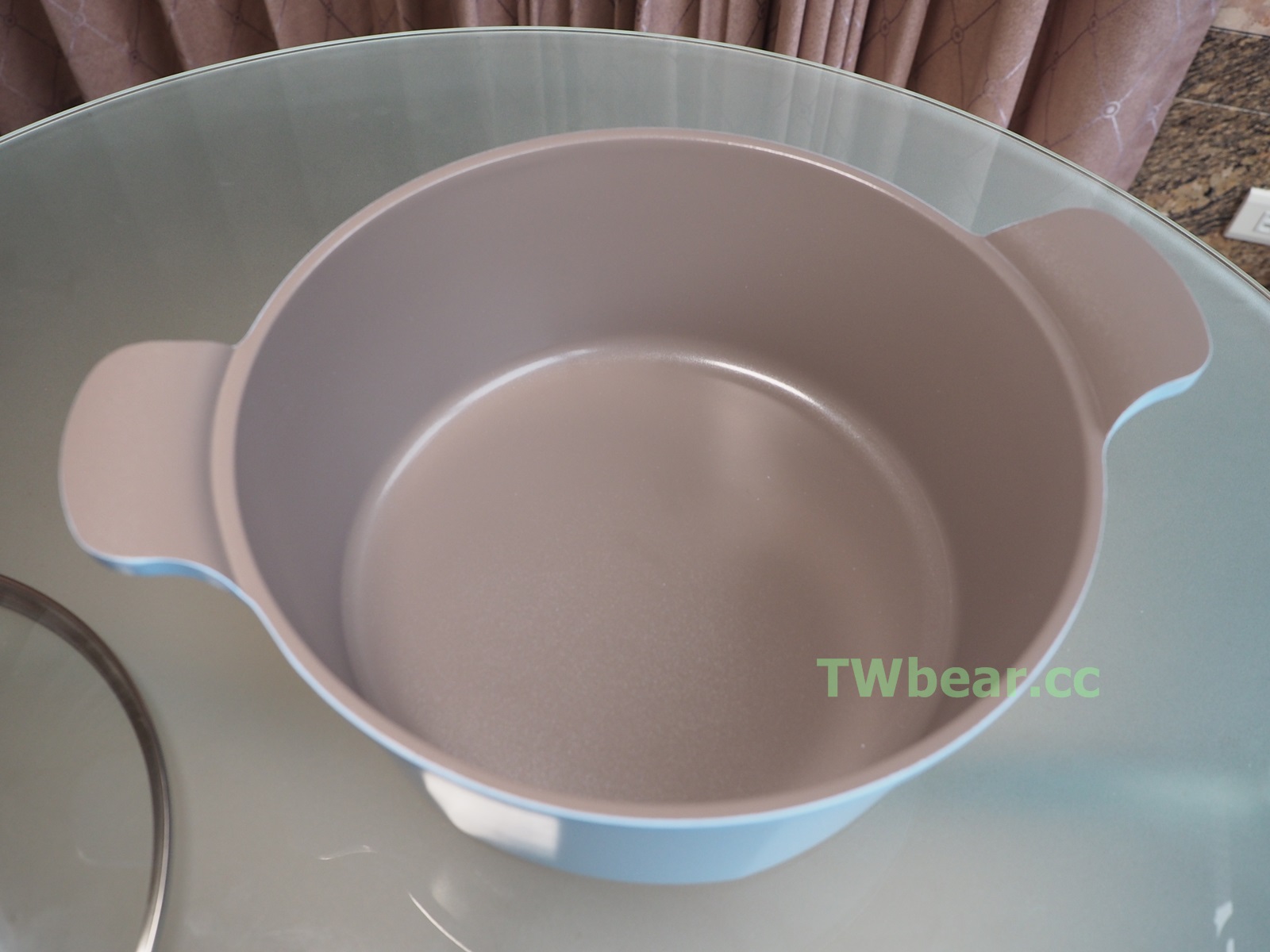鍋子內部的塗層完整的做到把手上面,所以視覺上真的很好看,不輸外表的馬卡龍色調的粉藍。