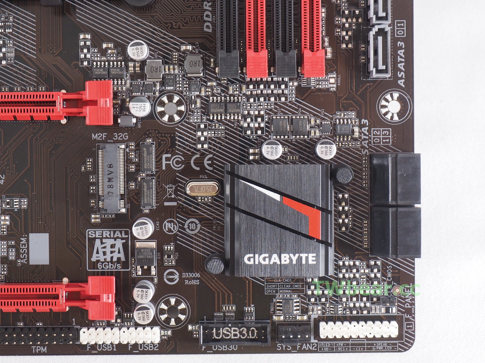 PCH周邊重鎮,SATA3 採用 4+2的分離配置,方便裝機或是需要放電(CLEAN CMOS)時不用翻找手冊,就特別放上特寫,包括看到的祥碩ASM1480晶片。
