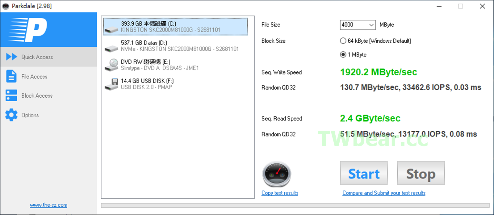 KINGSTON SKC2000M8-1000G韌體版本為S2681101,順便跑SSD-Z的一些測試。